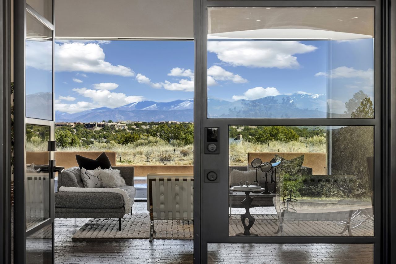 An experience with no parallel ? relaxed but elegant living at its best. Unstoppable sunrise and sunset views stretch across the Sangre de Cristo and Jemez Mountains, uninterrupted and ever-changing, with no distractions to take away from privacy, the exclusivity, and the quality of this property. 17 Hacienda Vaquero is a Contemporary Pueblo by Native Son Builders, set within the Estancias of Las Campanas. More than 4,200 square feet of refined interior space pairs with over 1,600 square feet of outdoor living, where covered portals, a kiva fireplace, and an in ground spa with waterfall?and infinity edge?create a seamless connection to the landscape. The great room centers on a custom gas fireplace and opens effortlessly through motorized sliding walls to brick floors that continue outdoors, blurring the line between inside and out. The kitchen is appointed with Wolf appliances, a Sub-Zero refrigerator and freezer, two Asko dishwashers, a walk-in pantry, and a refrigerated wine display. A mudroom and laundry area sit just off the three-car garage, while a porte-cochere offers covered arrival. A private attached casita includes a kitchenette, living area, and its own portal, ideal for guests or extended stays. Just minutes from downtown Santa Fe this home is set in the exclusive Estancias area of Las Campanas, a private club offering two Jack Nicklaus golf courses, a world-class equestrian center, fitness center, and spa. Optional membership provides access to dining, pools, racquet sports, and more, along with 24-hour security and on-site paramedics and EMTs.