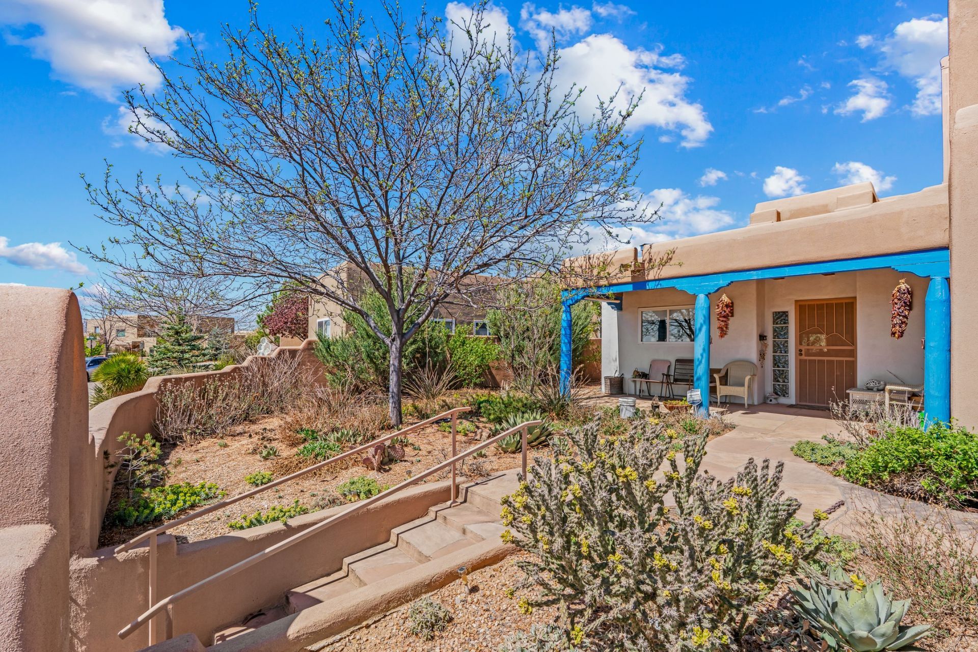 Santa Fe?style home in Pueblos del Sol with 3 bedrooms, 2 baths, and a separate studio above the garage. Built in 2004, the main residence offers approximately 1,625 sq ft, the studio is 425 sq ft, the entire living space is 2,050 sq ft. The layout is practical and consistent, with Saltillo tile flooring throughout and diamond plaster wall finishes. Exposed beams carry through the main living areas, where a wood-burning kiva fireplace anchors the space. A sunroom extends off the living area and opens to the backyard. The kitchen is arranged in a U-shape, allowing for continuous workspace, with Silestone countertops, stainless steel appliances, gas range, and backsplash of hand-painted tile. Storage is distributed across multiple cabinets and work zones. The primary suite includes direct outdoor access and a bath with dual sinks, separate jetted tub and shower. Two additional bedrooms are located near a bath with a walk-in shower. Heating is provided by radiant floor systems via a natural gas boiler, with mini-split units in the living/dining area, primary bedroom, and studio for targeted climate control. The studio above the two-car garage has a separate access point, its own 3/4 bath, and good natural light, supporting use as workspace, guest quarters, or rental. The roof was completely replaced and the parapets reconstructed in 2023; the radiant heat boiler was replaced in 2022, and the gas-fired water heater was replaced in 2021. Located within a neighborhood with established walking paths and access to community amenities, the property is positioned for convenient access to shopping, schools, and main routes across Santa Fe. The combination of solid construction, consistent materials, and flexible auxiliary space supports a range of use scenarios and long-term value.