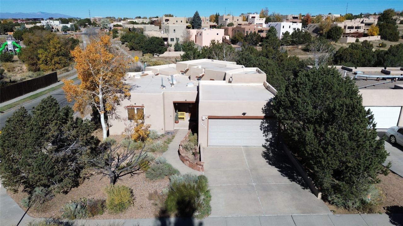 Don't miss this charming single-level home in Pueblos del Sol featuring three bedrooms and two bathrooms. This residence showcases classic Santa Fe details such as Vigas and a cozy Kiva fireplace. Lots of natural light streaming in from five skylights throughout the home. The home is positioned with southern exposure at the front and northern exposure at the rear. Mature trees provide exceptional privacy, with only one neighboring property. The surrounding trees and covered deck help keep the home cool in the summer, complemented by central air conditioning. Central heating ensures comfort and warmth throughout the winter months. The open floor plan provides great flow and comfortable bedroom separation, while the spacious deck with a solid portal?accessible from both the living room and primary bedroom?offers the perfect place to relax and enjoy the beautiful mountain views. York Central air conditioning and a two-car garage complete this wonderful Santa Fe home. Additionally, the raised subfloor design allows for easy access to plumbing for repairs or modifications. Situated on a large, beautifully landscaped corner lot with native plants and an apricot tree, the property backs onto a greenbelt for added privacy. Recent updates include a finished garage with a new door (2016), a new TPO roof (2021), new coyote and dog-eared fencing (2021), stucco patched and stained (2025), a new sump pump (2023), and a new tankless water heater (2025). We invite you to come take a look at this wonderful property.