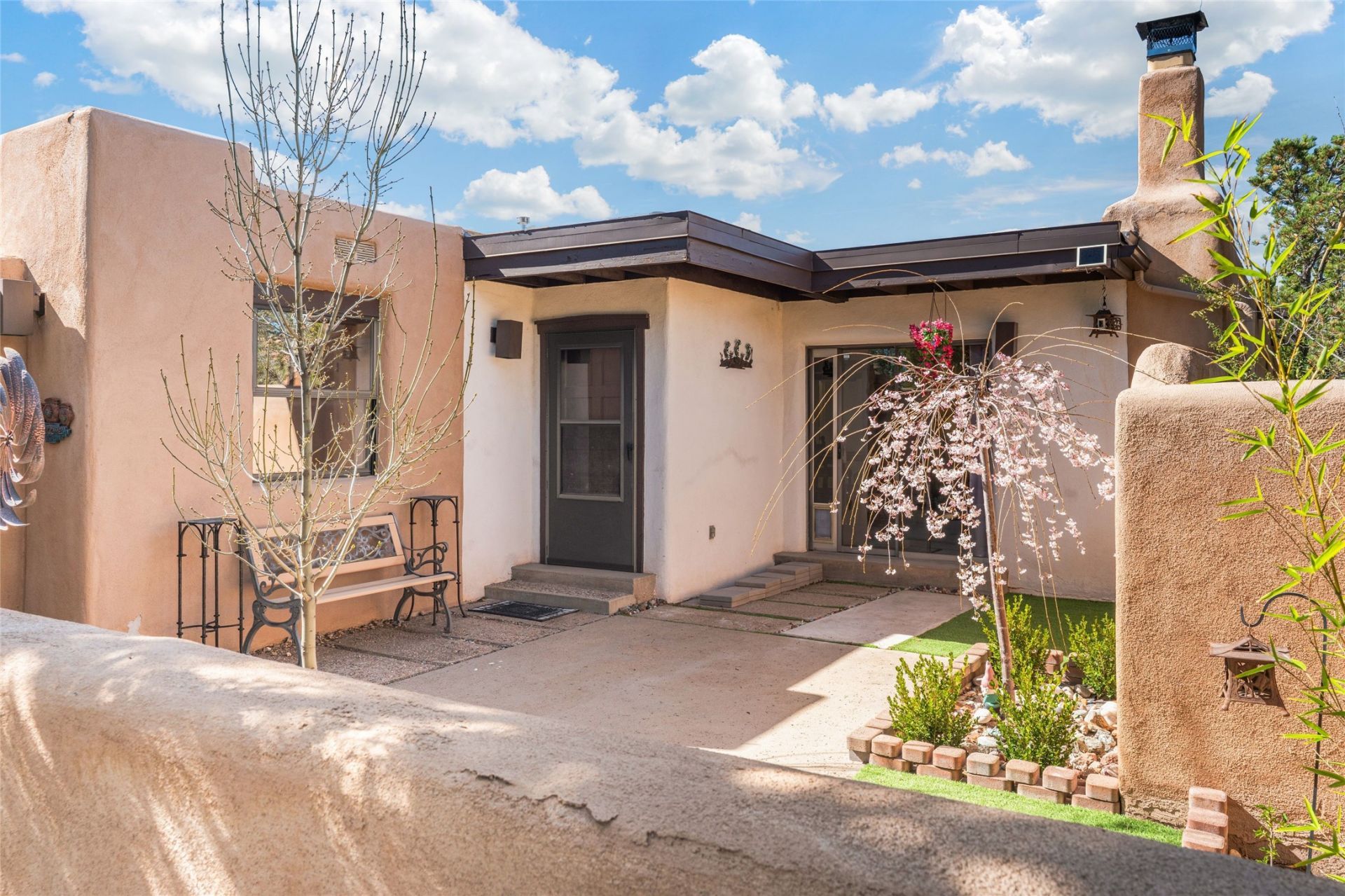 Desirable Northside single-level corner-unit condo with timeless Pueblo character, abundant natural light, and spacious living areas. Enter through a charming walled courtyard, where a blooming cherry blossom tree adds seasonal beauty to the approach. Inside, a dramatic skylit atrium forms the heart of the home, beautifully framed by a large architectural opening from the living room that creates a signature focal point. Exposed beams throughout, banco seating, sculptural stepped Pueblo-style forms, and a kiva wood-burning fireplace bring warmth and authentic Santa Fe character. The southeast-facing orientation welcomes the first light of sunrise onto the living room floor, while moonlight through the atrium adds a rare sense of calm and beauty at night. The thoughtfully separated bedroom layout offers comfort and flexibility, and the attached one-car garage provides additional storage. This property has been lovingly maintained and is priced accordingly for expected renovations. Ideally situated on Santa Fe's coveted Northside, the home enjoys a setting that offers both tranquility and convenient access to the Plaza, the Santa Fe Opera, and Ski Santa Fe, along with the quiet pleasure of frequent deer sightings that add to the natural beauty of the neighborhood.