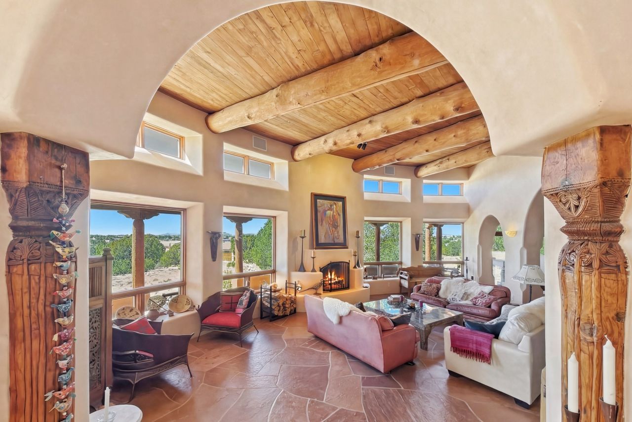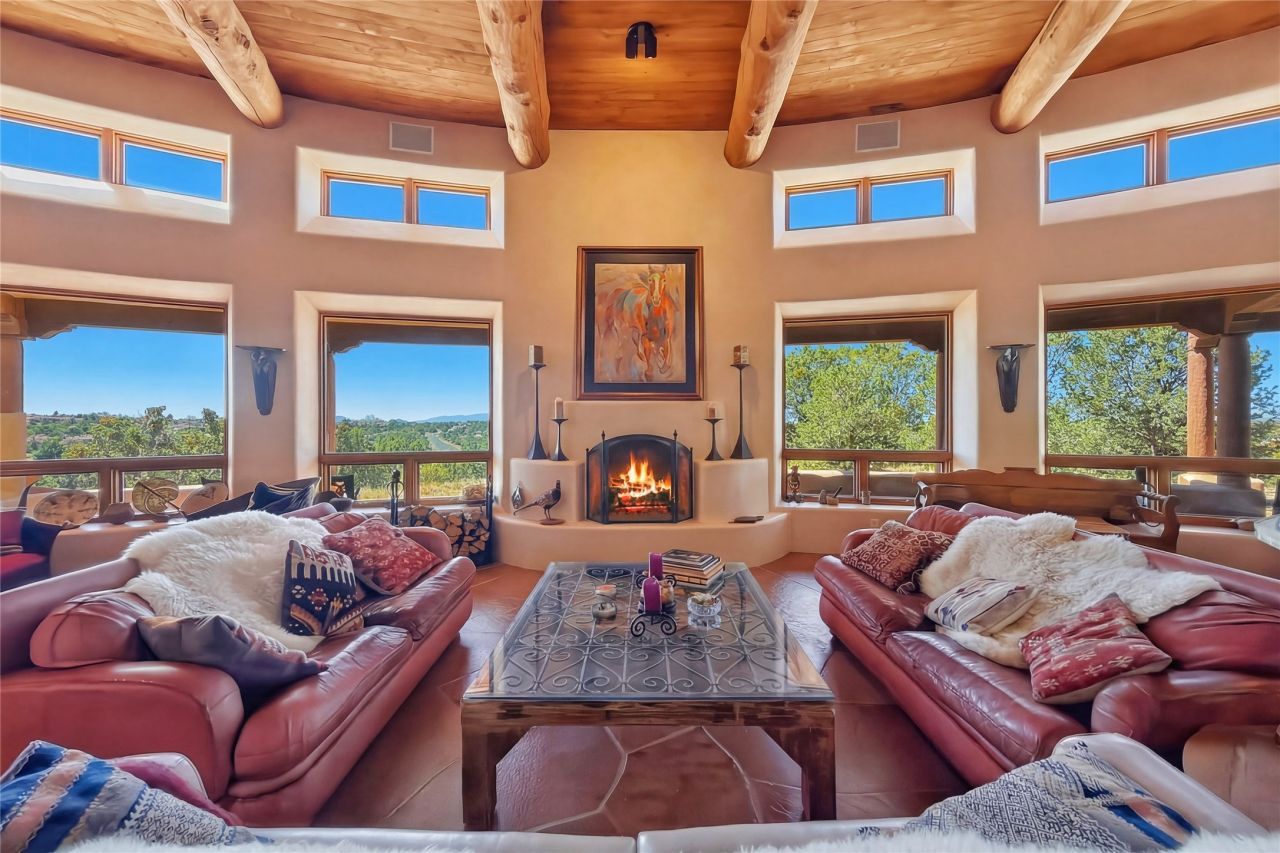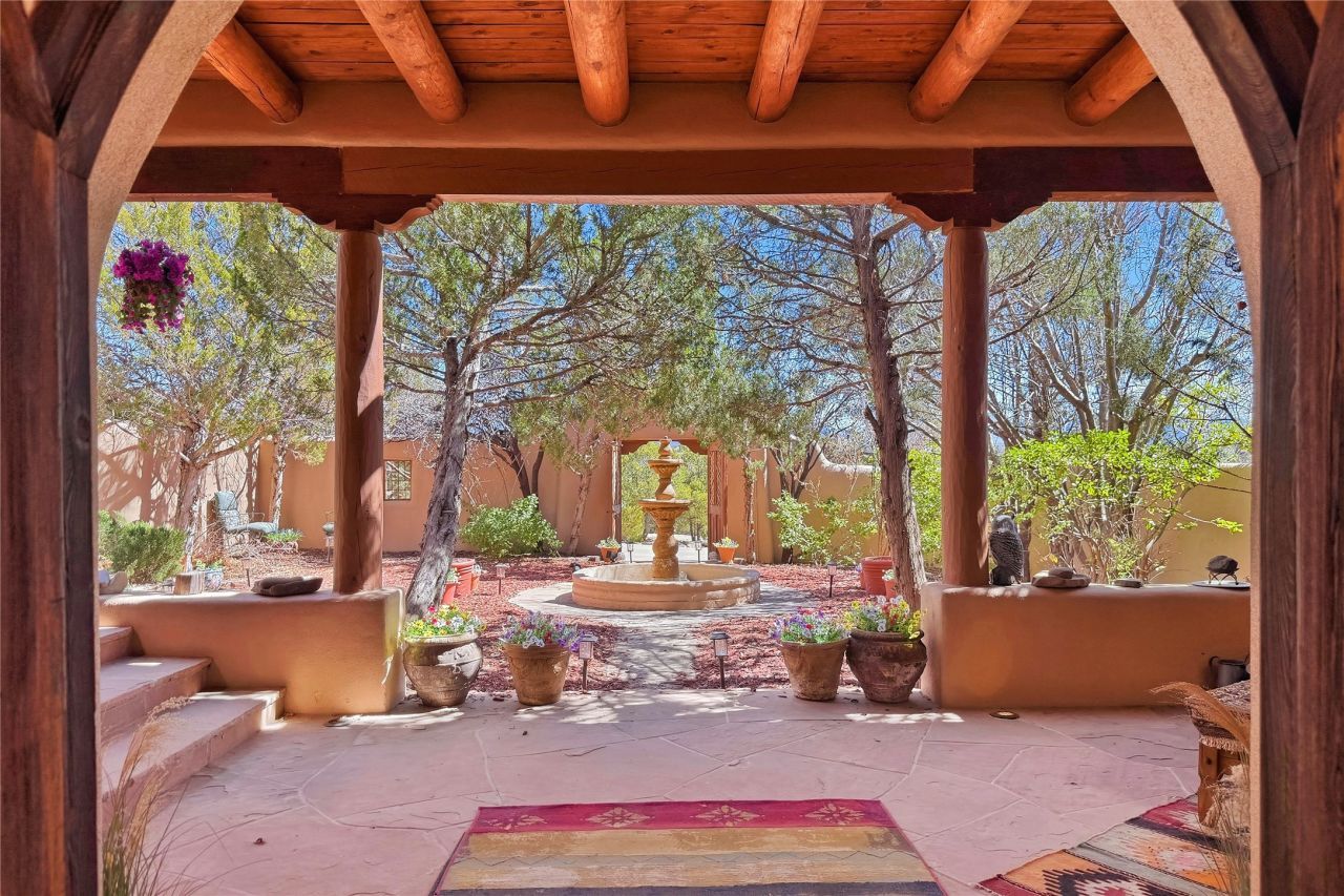 $300,000 Price improvement & Seller is motivated! Featured in the New York Times! Discover the grandeur of this stunning Spanish Colonial hacienda residence on an elevated lot in Las Campanas with panoramic mountain views. Offering 5,172 sq ft of custom living space on 1.53-acres, this home is designed for both privacy and elegance, featuring exceptional separation of spaces. With four spacious bedrooms and four bathrooms, this property is ideal for those seeking a refined living experience. The bedrooms have great separation for comfort and privacy. The attached guest house with a kitchen is ideal for visitors or extended family. Art enthusiasts will appreciate the abundant wall space, perfect for displaying treasured collections. The beautiful colonial doors and intricate architectural details add a touch of old-world charm throughout the home. Enjoy breathtaking 360 degree views of the Jemez and Sangre de Cristo mountains from the roof deck. The enchanting courtyard with center fountain offers a serene outdoor retreat, ideal for relaxing and enjoying the tranquil surroundings. The courtyard offers lounging, outdoor grilling, and entertaining. This peaceful oasis is surrounded with mature landscaping. Located on a quiet cul-de-sac, this property combines the best of privacy and community living. Don't miss the opportunity to own this magnificent, custom home that blends Spanish Colonial elegance with modern comforts.