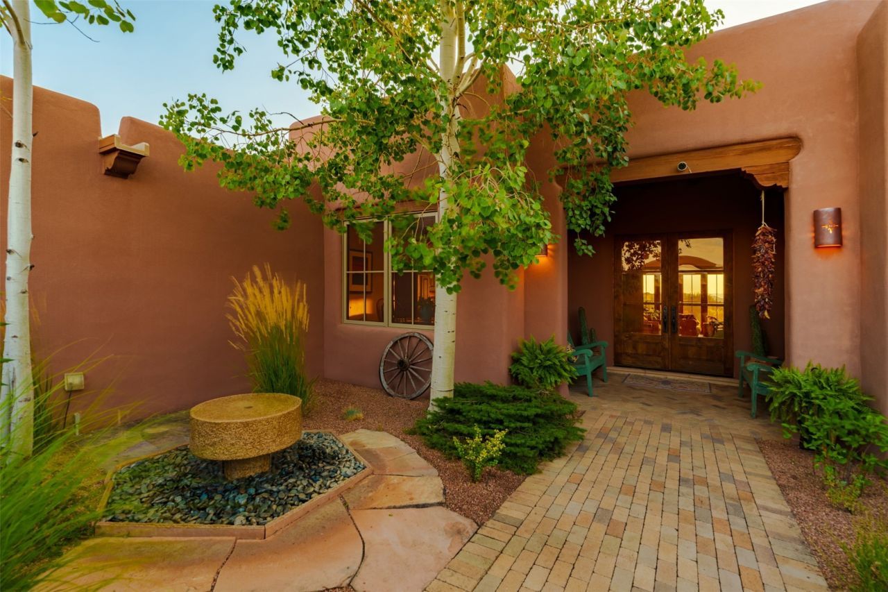 Experience Timeless Santa Fe Elegance in Las Campanas. Approach this exceptional Las Campanas residence through a walled courtyard shaded by mature aspens and graced with fruit trees. Step through the grand rustic wood double doors into a spacious, light-filled central living area that seamlessly unites the living room, dining space, gourmet kitchen, and breakfast nook. Three bedrooms with an office - the home's layout offers perfect privacy: the primary suite and office are thoughtfully situated in one wing, while two guest suites occupy the opposite side. Throughout, traditional Santa Fe craftsmanship shines?diamond plaster walls, vigas, carved corbels, and built-in shelving and nichos that invite you to showcase art and treasured objects. The living room centers around a large kiva fireplace and frames views of the Jemez Mountains. Glass doors open to an expansive portale, ideal for entertaining or simply savoring the views. The gourmet kitchen features a six-burner Wolf range, wine cooler, granite countertops, center island, and connects to a charming breakfast nook with its own kiva fireplace. The primary suite is a serene retreat with a kiva fireplace, two large walk-in California Closets with built-in storage, and a luxurious bathroom featuring a bidet toilet, steam shower, and jetted tub. Step directly from the suite onto a private portale for morning coffee or evening stargazing. A spacious office with a built-in double desk completes this private wing. Each guest suite offers an en-suite bathroom, and access to a shaded portale; one bathroom includes a double vanity and jetted tub. Outdoor living is enhanced by large, shaded portales with high viga ceilings. The main portale features a built-in gas grill and automated shades. Mature aspens, fruit trees, and lush landscaping create a peaceful, private sanctuary. This home blends the soul of traditional Santa Fe design with the comfort and functionality of modern luxury?all in the heart of Las Campanas.