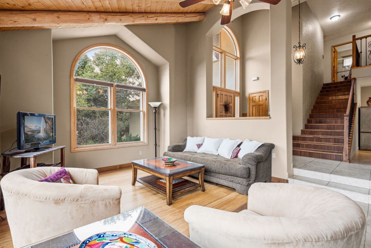 Set on more than five wooded acres just 20 minutes from the historic Santa Fe Plaza, this Spanish-style retreat offers rare privacy, expansive views, and the feeling of owning your own secluded oasis while remaining close to town. Elevated above the road and surrounded by native piñon, pine, and cedar, the property enjoys rolling terrain, endless skies, and sunsets that glow in gold and crimson before giving way to brilliant, star-filled nights. The setting is peaceful, immersive, and grounding. Inside, natural light pours through generous windows, illuminating soaring ceilings and open living spaces that feel both grand and inviting. Warm wood and tile flooring, iron accents, and timeless architectural details reflect authentic Spanish character. The beautifully refreshed kitchen anchors the home, offering generous space to gather, cook, and entertain with ease. Upstairs, spacious bedrooms provide comfort and privacy, including one with a balcony set among the trees. The primary suite serves as a private sanctuary with a deep soaking tub and oversized shower for a spa-inspired experience. A detached studio offers flexibility for guests, creative pursuits, or a home office. Outdoors, enjoy curated landscaping, a tranquil pond, covered patio with traditional horno, and fenced space for pets. Offering land, light, views, and proximity, this is Santa Fe living at its most serene, a rare opportunity to experience space, beauty, and quiet connection to nature just minutes from the Plaza.
