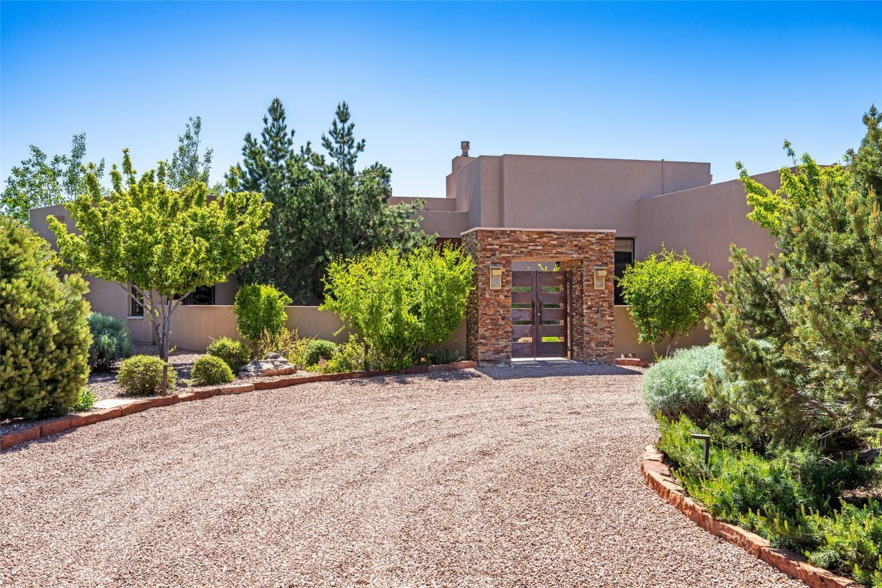 Discover a refined blend of timeless Southwestern charm and modern sophistication in this contemporary Pueblo-style home sited on 1.8+ serene acres with Jemez Mountain views. A private entry courtyard with a tranquil stone water feature welcomes you into beautifully appointed interiors featuring stone accents and high-end finishes throughout. At the heart of the home, the grand chef's kitchen is flooded with natural light from skylights and appointed with top-tier appliances, custom cabinetry and an open, entertainer-friendly layout gracefully flowing to the spacious living room, dining room and portal. The generous primary suite is a private retreat with a cozy gas fireplace, two walk-in closets, dedicated office space, a spa-inspired bath and direct access to its own portal. The well-separated guest wing includes two spacious bedrooms, each with en-suite baths for comfort and privacy. An additional large office/den with a separate entrance and private portal provides an ideal workspace or creative studio. Outdoor living is exceptional ? a spacious rear portal features a large fireplace, outdoor cooking, a pass-through to the wet bar and beverage center, a second water feature and ample room for al fresco dining and relaxation. Practical amenities include a three-car direct-entry garage and a roof-mounted Solar Pro System array. This property offers an unparalleled sanctuary for those seeking privacy, elegance and effortless indoor-outdoor living.