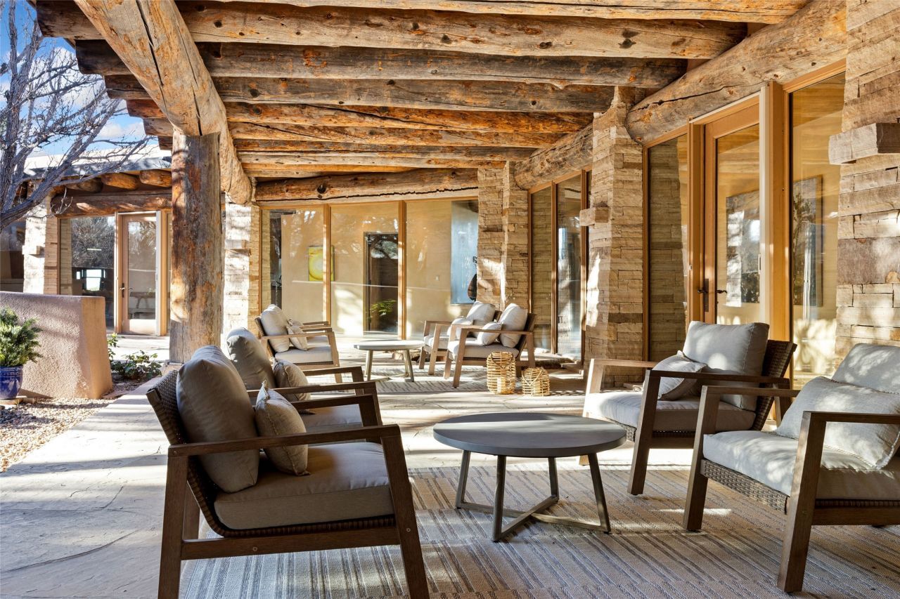 Welcome to 5 Penasco Circle, one of the most exciting estates in Santa Fe, this captivating estate impresses with commanding architecture, majestic mountain views and superior craftsmanship. Privately sited on a premiere 2.3-acre homesite within the famed Las Campanas community, this tour de force home by Turner Lechner & Romero, perfectly blends contemporary design with Northern New Mexico high desert luxury. The gallery-like formal living room stuns and welcomes as a grand centerpiece, flowing into a dining room encased in sheets of glass beneath an iconic hogan-style ceiling, framing surreal Jemez Mountain sunsets. At the heart of the home lies a professional-grade chef's kitchen, an epicurean sanctuary featuring high-performance luxury appliances, walk-in pantry, butler's pantry, and a breakfast bar that anchors the home's casual living and breakfast areas. The primary wing is a sanctuary of refined comfort, offering dual bedroom options with ensuite baths, two private offices, and stone-surround fireplaces?all opening to secluded courtyard living spaces. Three total walk-in closets ensure ample storage for the most discerning homeowner. Guests enjoy ultimate privacy in a dedicated wing featuring a spacious ensuite bedroom, plus two additional guest suites with private entrances. Additional design features include a separate media room/den with its own bath and an attached heated studio. Exceptional craftsmanship is showcased throughout the single-level interior, from quality plaster walls and rare massive vigas to curated natural stone and hardwood flooring. The outdoor experience is unrivaled, featuring vast entertaining areas, deep covered portals, and two covered entry portcacheres. A welcoming front courtyard leads to a rooftop deck providing 360-degree vistas of the high-desert landscape. With extensive guest parking and a tranquil, park-like setting, this estate represents the ultimate Santa Fe and Las Campanas lifestyle.