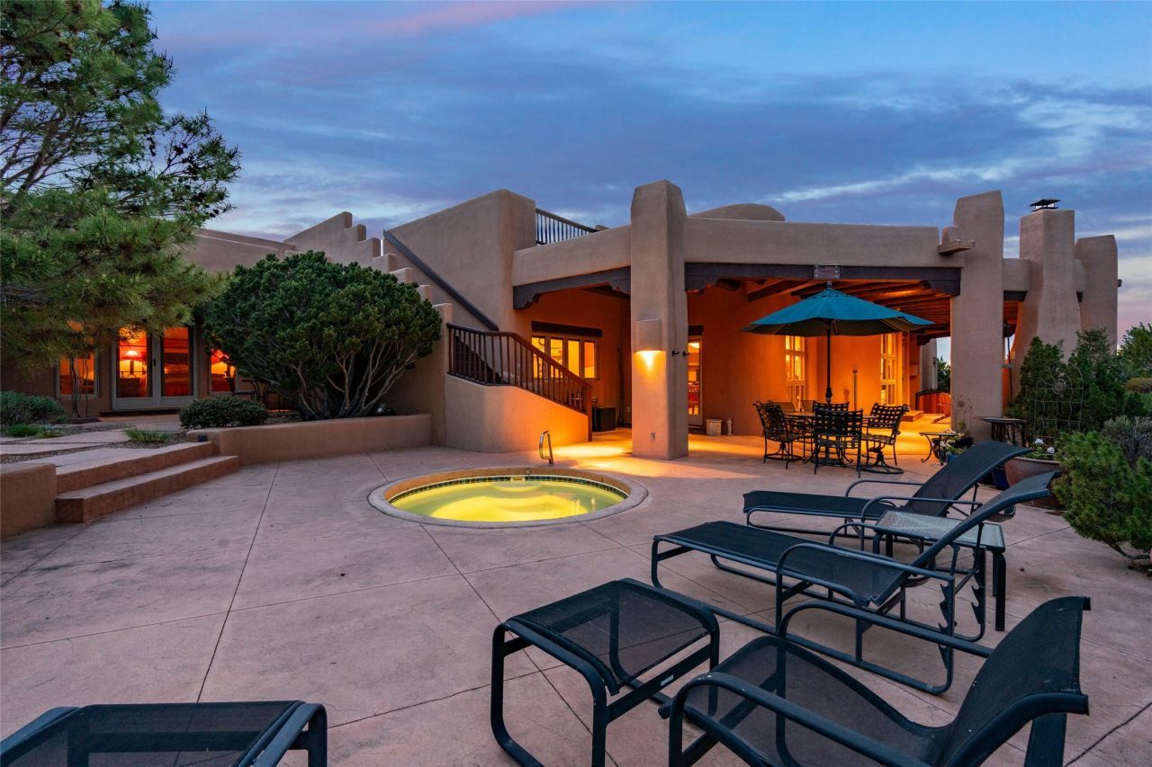 This Soft Contemporary 3-Bed + Den + Retreat / 3.5 -Bath home offers Sangre de Cristo Mountain Views in gated Las Campanas. The Great Room is truly Great, with 2 areas for socializing ? One with a Kiva Fireplace, built-in TV / entertainment niche & doors to the Front Portal area. The other is a conversation area with a free-flowing kiva fireplace, wet bar, room for a Baby Grand Piano, Sangre de Cristo views plus access to the Back Portal area with wood-burning kiva fireplace. The Dining area is perfect for sharing meals & has access to the Back Portal area with Built-in BBQ & in-ground spa. The Kitchen has a Sub-Zero refrigerator, Bosch Dishwasher, Dacor Oven & Microwave plus a generous island with Dacor gas cooktop & prep sink. There is also a walk-in wine storage area plus Buffet & Butler's Pantry, both with ample storage. The Owner's Suite includes a kiva fireplace, walk-in closet & its own private portal with a Sangre de Cristo Mountain view. The Owner's Bath offers 2 separate vanities, 2 separate water closets, walk-in shower with body sprays & direct access to the In-ground Spa & outdoor shower. Also in the Owner's Suite wing, there is a private Den / Office with walk-in closet & outdoor access through double French doors as well as a south-facing Library / Retreat area. Two secondary bedrooms, each with their own bathrooms, are on the opposite side of the home, creating privacy from the Owner's Suite. The spacious outdoor area offers a multitude of desirable features - Private In-Ground Spa, Outdoor Shower, Built-in BBQ, Extensive shaded portal areas with wood-burning fireplace & a spacious roof deck with 360-degree Mountain Views. The 3-car garage includes a third, separate stall that can be used as a studio. This fabulous home checks all the boxes ? 3 Bedrooms + Den + Retreat * 3 ½ Baths * 3-Car Garage * In-ground Spa * Outdoor Shower * Spacious Roof Deck * Sangre de Cristo Mountain views ? Make it yours Today!