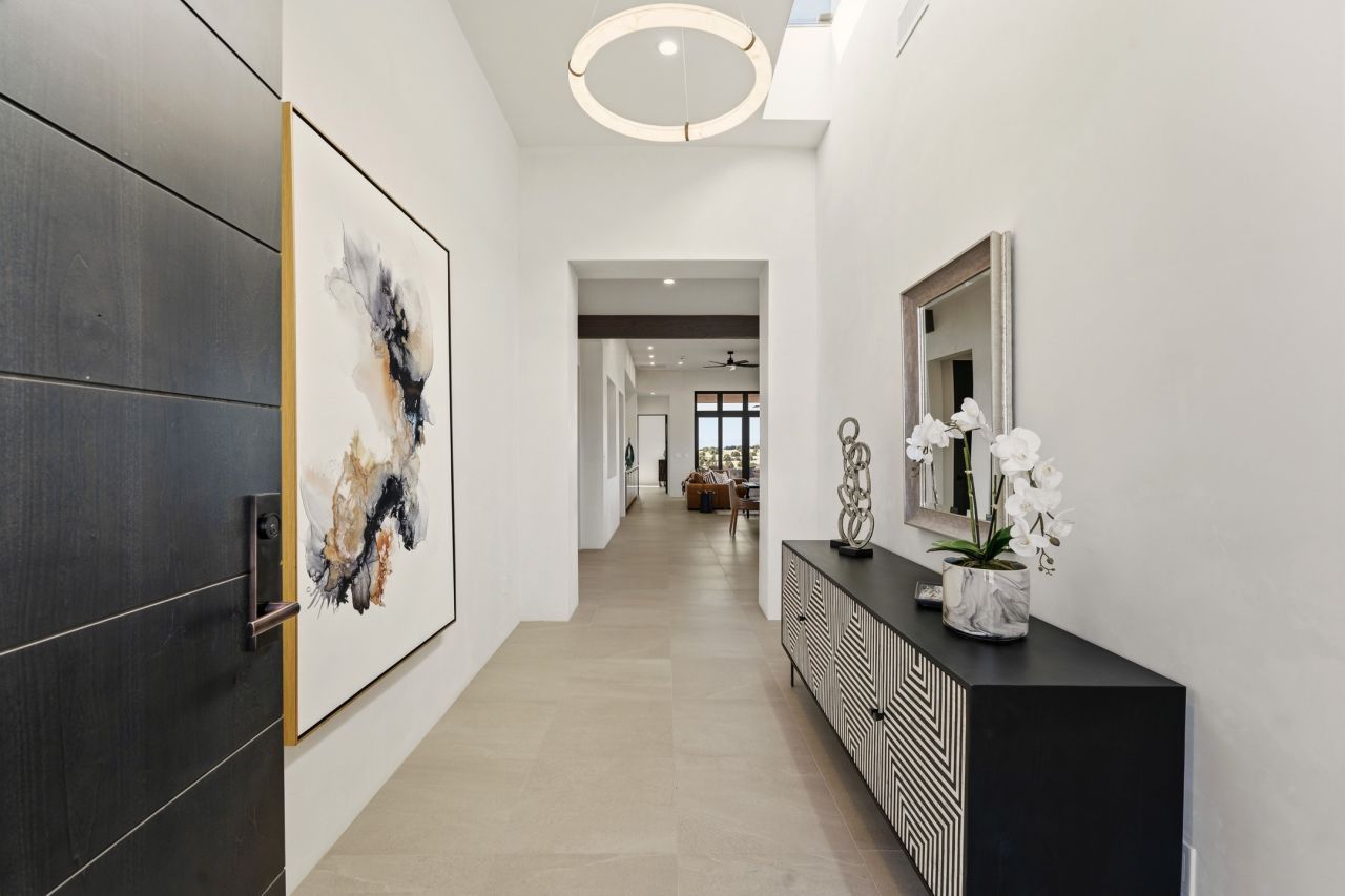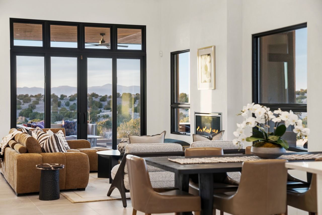 Newly completed and move-in ready, 9 Tierra Antigua (Lot #7) sits within one of Santa Fe's most thoughtfully conceived new communities ? a 44-acre high-desert enclave where more than half the land is preserved as open space, trails wind toward the horizon, and the Sangre de Cristo Mountains frame the morning sky. With homes designed by award-winning firms Five Ten Architecture and studioBOSE, Tierra Antigua honors Northern New Mexico's heritage with a modern eye for light, craft, and quiet luxury. Arete Homes of Santa Fe proudly presents the Stargazer Plan ? a 2,495-square-foot custom residence with 3 bedrooms and 3 baths (including two ¾ baths and a powder room). Contemporary Pueblo-style architecture blends seamlessly, capturing sweeping views of both the Jemez and Sangre de Cristo Mountains. A formal entry with expansive art walls and wall-wash skylights creates a gallery-like ambiance. Soaring vaulted ceilings in the great room flow into over 1,100 square feet of covered portal space ? perfect for year-round indoor-outdoor entertaining. The chef's kitchen features natural quartzite countertops, custom white oak cabinetry, a center island with wine refrigerator, and premium GE Monogram appliances including a 48 6-burner range with griddle and built-in refrigerator. An outdoor kitchen with built-in grill completes the entertaining experience. Luxury finishes throughout include quartzite backsplash, designer sconces, large-format porcelain tile, custom bath tile accents, customized closet systems, and two fireplaces. Located just 15 minutes from downtown Santa Fe and minutes from the Club at Las Campanas, Tierra Antigua offers privacy, natural beauty, and cultural access. Only 23 homesites total. HOA dues are just $167/month. This is more than a home ? it's an entry point into a community designed for those who want to live within Santa Fe's spirit every day. Additional homesites available for custom builds or from five curated plans.