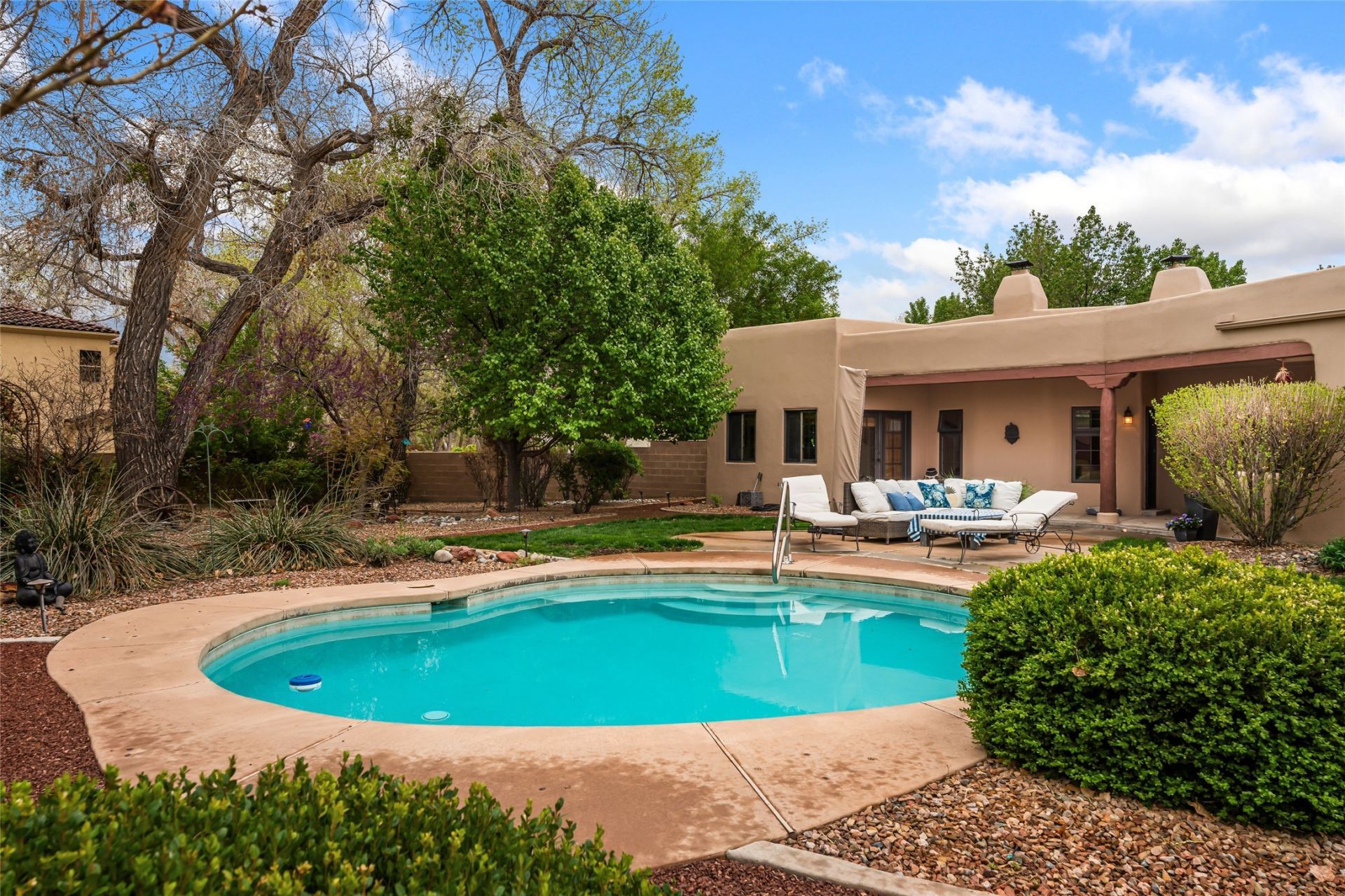 Unparalleled beauty and luxurious style exude not only from the picturesque backdrop of the Sandia Mountains, but also from this stunning custom home built in 2001 located in the gated Bosque Encantado community, a hidden gem near Bernalillo. The home sits on a little over 1 acre with a private irrigation well in place to accommodate the sumptuous landscaping. A heated pool is a focal point of the back yard with plenty of shade from mature trees and gardens, perfect for spring and summer outdoor entertaining. A covered patio, hot tub and outdoor kitchen complete the outdoor space. Inside, the large and open feel of the living and dining areas is dramatically defined by high ceilings with vigas, latillas and accented by lovely kiva fireplaces in the living room and kitchen. The well-appointed chef's kitchen has high-end stainless steel appliances, warm lighting and granite countertops in place. The primary suite is separated from the two secondary bedrooms to ensure privacy. The primary en-suite has a spa-like feel with a large wood-burning fireplace in the bedroom, a soaking tub, spiral shower and walk-in closet with custom cabinets nearby. There is a work out area, in addition to two separate offices, one with a Murphy bed adding versatility for overnight guests. The property itself also has a two-car garage with an additional oversized RV bay with nearby hookup for sewer, water and electricity (30 amp inside and outside). The home has been impeccably maintained with newer mechanicals in place. The location is convenient for those looking for access to nearby shopping, but with exceptional trail access to the nearby Rio Grande Bosque.
